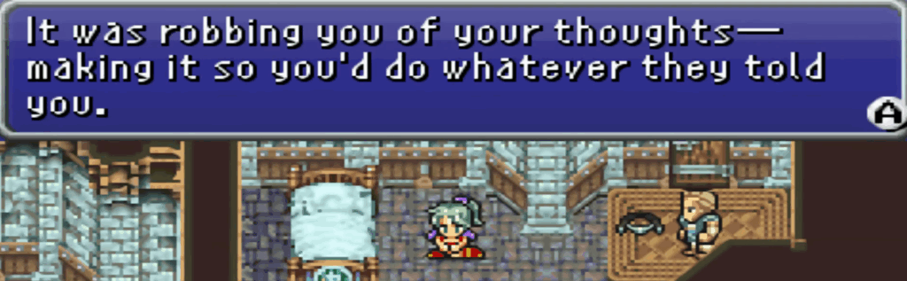 Easy, there! This is a slave crown. The others were using it to control you. It was robbing you of your thoughts, making it so you’d do whatever they told you.