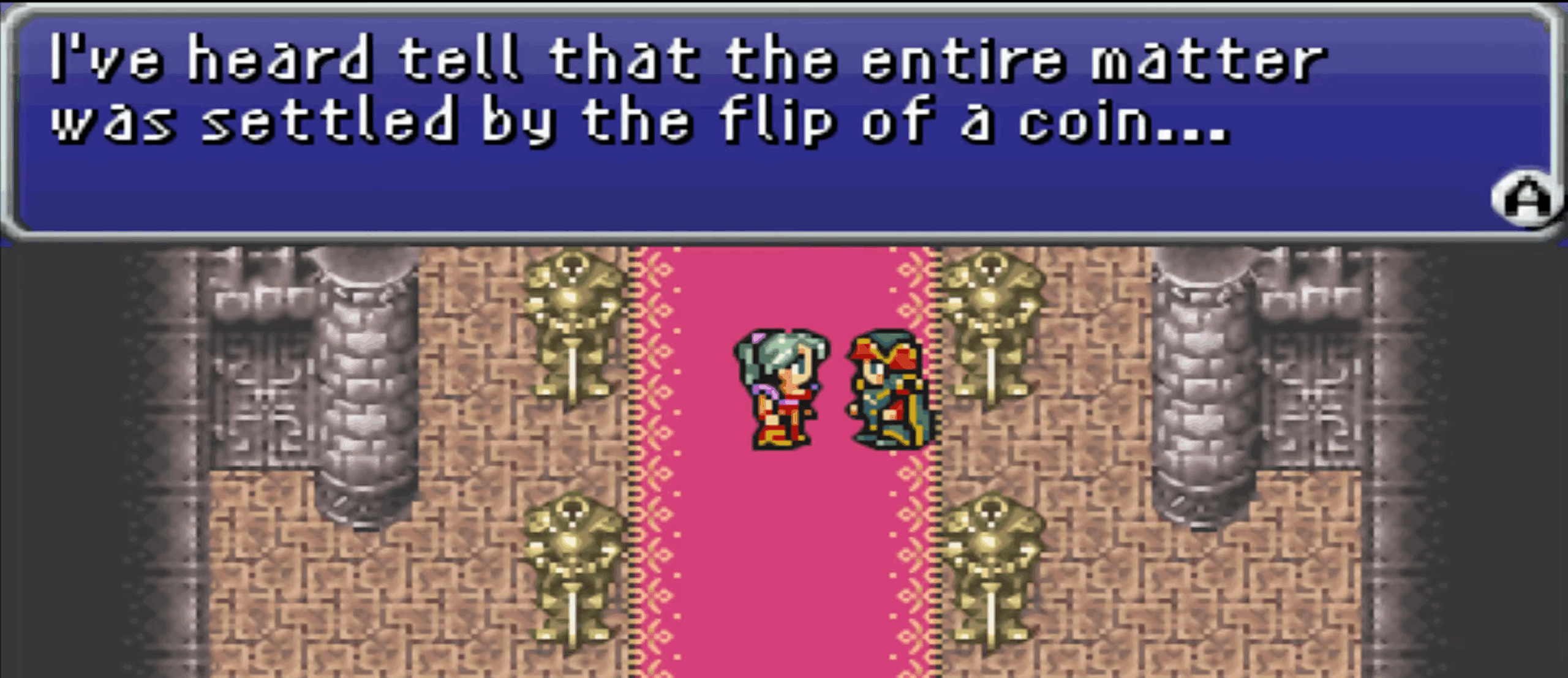 フィガロの大臣から、エドガーとマッシュの運命を決めたコインの話が聞けます。これには裏話があるのですが、それはまたいつか…。この”heard tell that”の文語的表現は知らなかったので、一瞬?となりました。そしてここでの”settled”には力強さを感じます。話をすでに知っているせいもありますが、おそらく”the entire matter”→”was settled”の流れが自然な力強さを生んでいるような、そんな気がした表現でした。