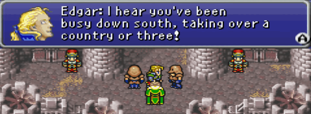 ケフカが初登場後、フィガロ城に乗り込んだときのやり取りから。この”a country or three”でいきなりなぜ”three”なのかと疑問に思ったところ、大げさに言う表現だそうです。こうした気持ちが乗ったセリフは面白いですね。知らなかったです…純ジャパの泣き所ですね。
