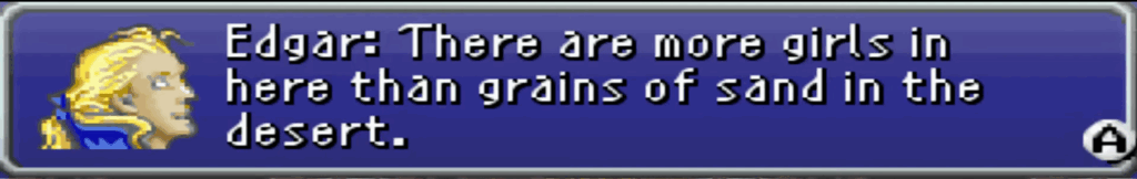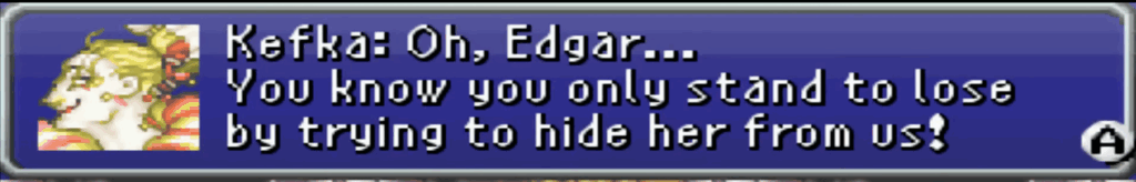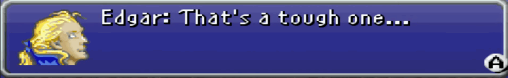 - ここでは、兵士に「その女はどこだ?」と問われて、 エドガーが軽くおどけながら時間を稼いでいる感じ。 → 「さてなぁ… こりゃ答えるのが難しいな」とごまかしている。