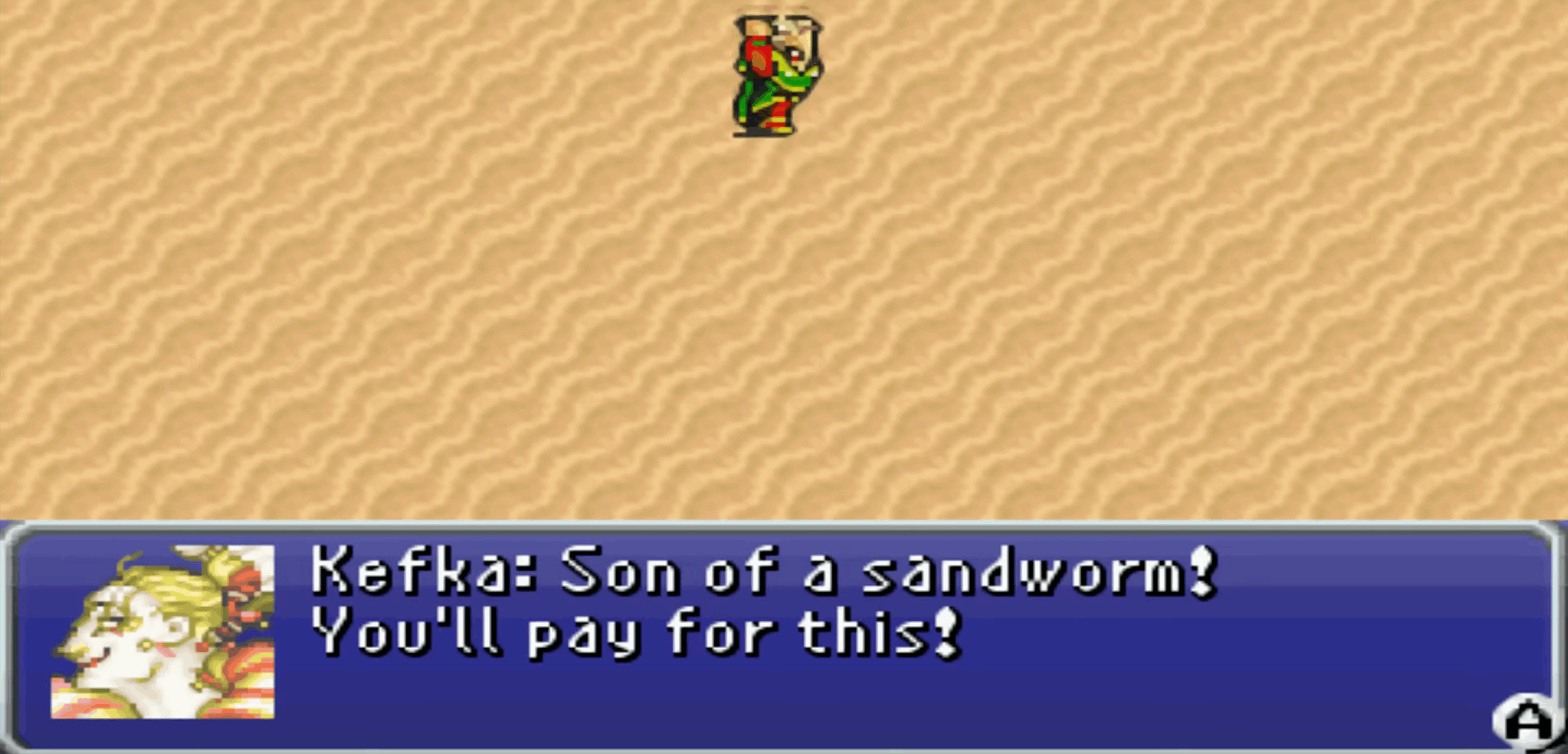 負け惜しみのセリフとしてお馴染みだったので取り上げてみました。いわゆるジャイアン的な「覚えてろよー」な雰囲気です。ここのsandwormはエドガーのことを指していると思います。砂漠にある城の王様のことを罵っている負け惜しみセリフだと思います。しかしこの頃のケフカは愛すべき小悪党感がよく表されていて面白いです。